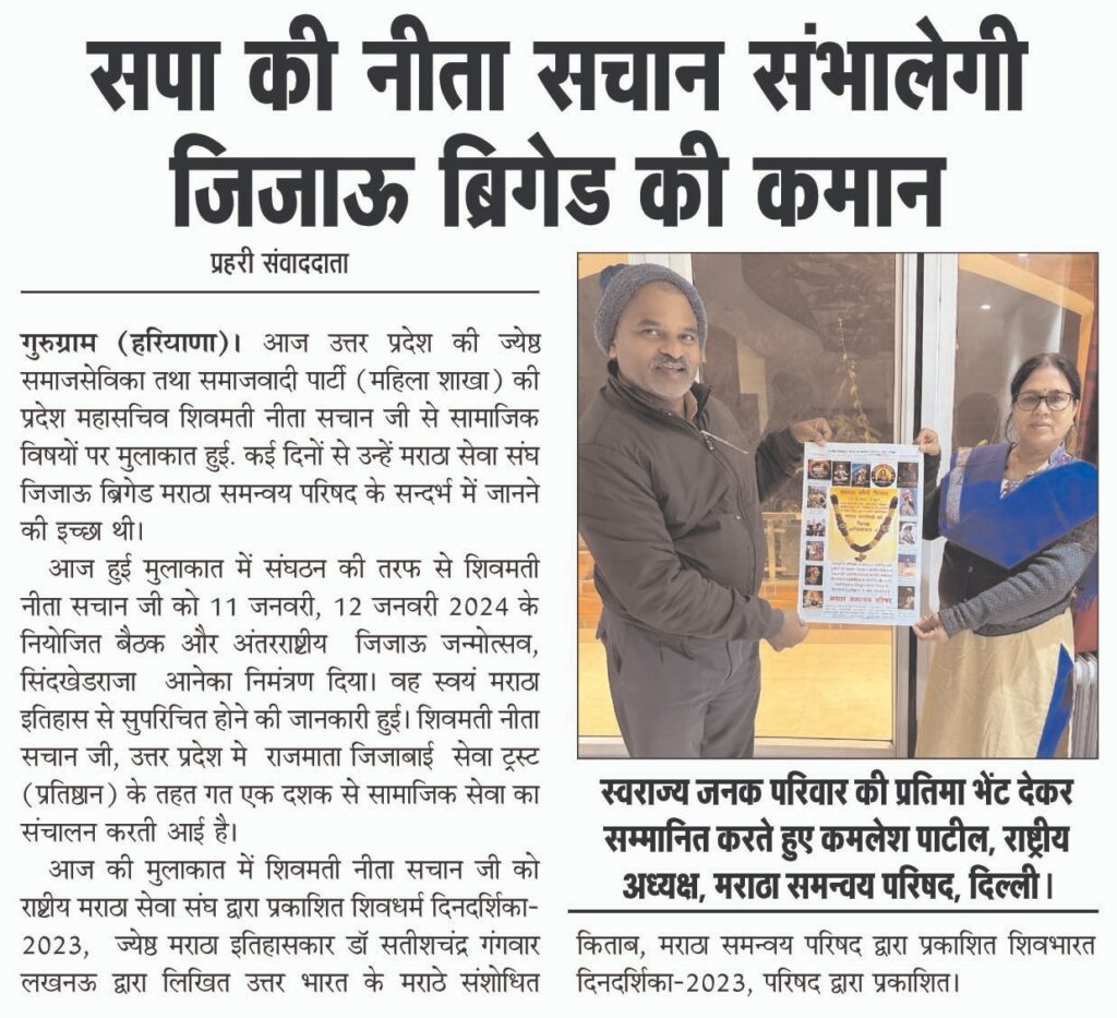 गुरुग्राम(हरियाणा): आज उत्तर प्रदेश की ज्येष्ठ समाजसेविका तथा समाजवादी पार्टी (महिला शाखा) की प्रदेश महासचिव शिवमती नीता सचान जी से सामाजिक विषयों पर मुलाकात हुई. कई दिनों से उन्हें मराठा सेवा संघ जिजाऊ ब्रिगेड मराठा समन्वय परिषद के सन्दर्भ में जानने की इच्छा थी.आज हुई मुलाकात में संघठन की तरफ से शिवमती नीता सचान जी को 11 जनवरी, 12 जनवरी 2024 के नियोजित बैठक और अंतरराष्ट्रीय जिजाऊ जन्मोत्सव, सिंदखेडराजा आनेका निमंत्रण दिया. वह स्वयं मराठा इतिहास से सुपरिचित होने की जानकारी हुई.