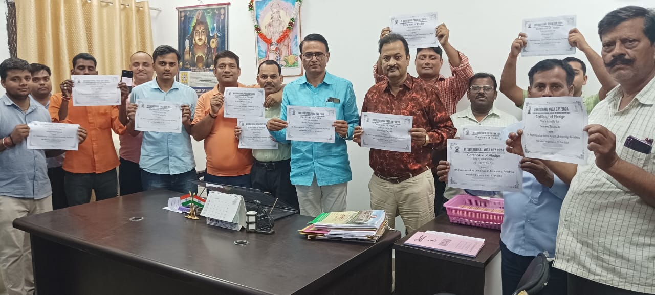 वहीं परिसर के कर्मचारियों ने भी शपथ सर्टिफिकेट डाउनलोड कर योग के प्रति संकल्प लिया। इस मुहिम को शिक्षकों में डॉ. अजय कुमार शुक्ला, डॉ. अंकुर श्रीवास्तव, डॉ. विमल कुमार, कुणाल अगम, विनीत भारती, विष्णु प्रसाद यादव, प्रभा मंजरी और दीपा यादव सहित अन्य संकाय के सदस्यों ने विद्यार्थियों को शपथ दिलाई। वहीं कर्मचारी परिषद के अध्यक्ष व प्रशासनिक अधिकारी परीक्षा एवं नामांकन राजेश पाण्डेय व विभागीय कर्मचारियों में डॉ. राजेश सिंह, रवीन्द्र पाण्डेय, कृष्णा, संतराम, हरीश, संजीव श्रीवास्तव, दिलीप, अंशुमान, डॉ0 आदित्य सिंह, शरीफ, प्रदीप, पंकज, शुभम, शिवानी, राजीव, रामजी, सुरेन्द्र, रामजनक, राजेन्द्र, श्यामजी सहित बड़ी संख्या में कर्मचारियों ने योग का संकल्प लेते हुए शपथ ली।